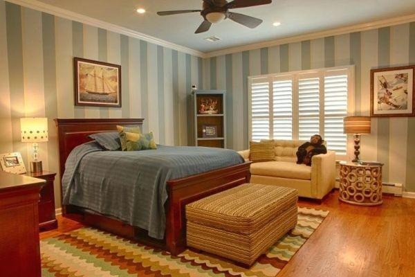 Fabrics in the room can be changed to achieve the desired effect as well. Long, floor-touching curtains can echo the wall design and enhance the illusion of height. Solid bedcovers with striped cushions in matching colors can add to the coordination. A rug can also be used — either solid to create balance, or striped to reinforce the theme.